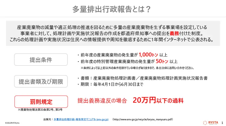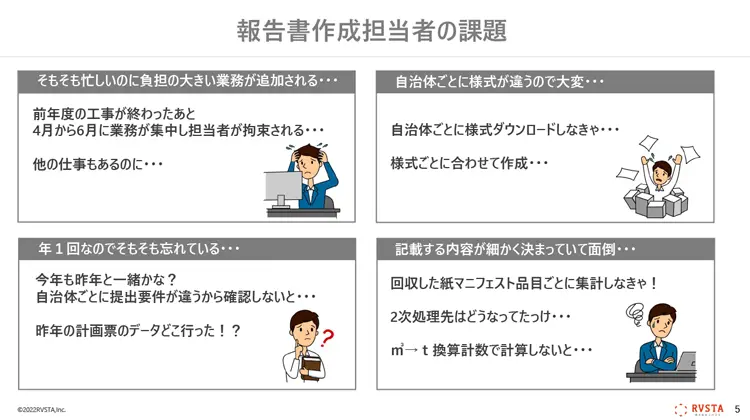 株式会社リバスタでは、電子マニフェストサービス「e-reverse.com」のオプションとして、多量排出行政報告をラクにする、「多量排出行政報告支援サービス」を提供しております。下記の悩みをお持ちの方は、ぜひ資料で詳細をご覧ください。