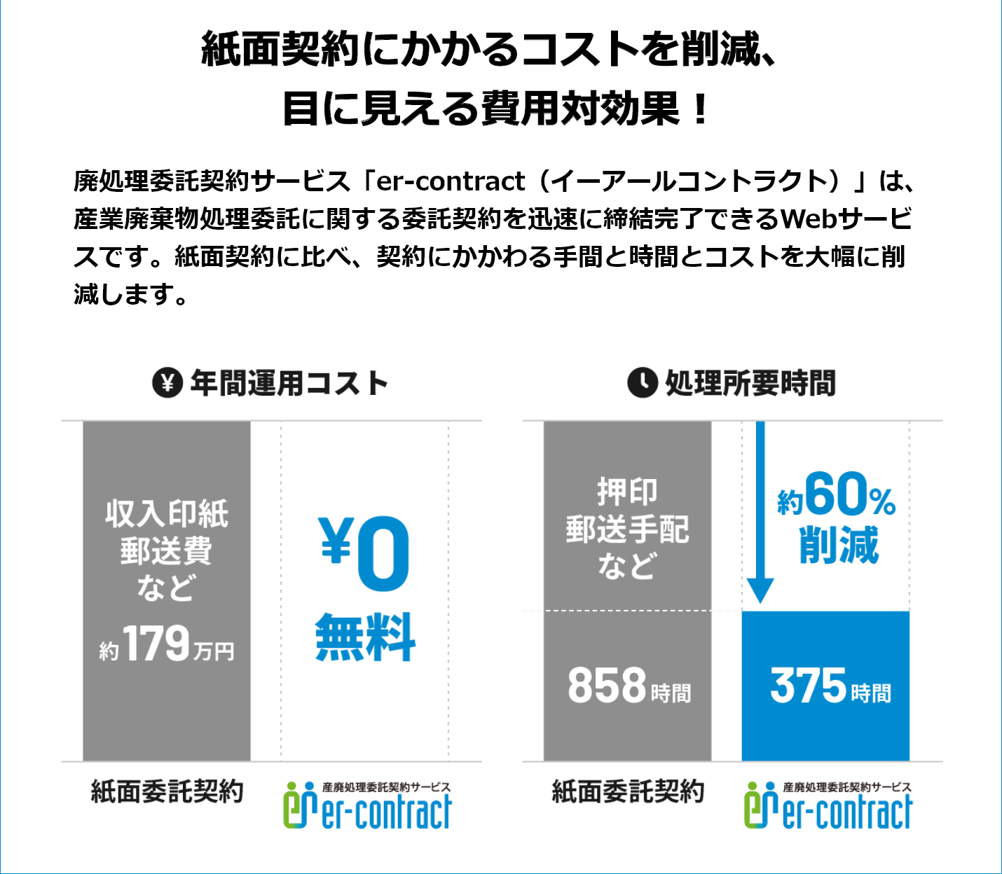 印紙税法上、電子契約は課税対象外となり、高額な収入印紙の負担は不要となります。紙面委託契約でかかっていた収入印紙や郵送費といった運用コストは、er-contractをご利用いただくことで0円となるため、大幅な運用コストの削減を実現します。