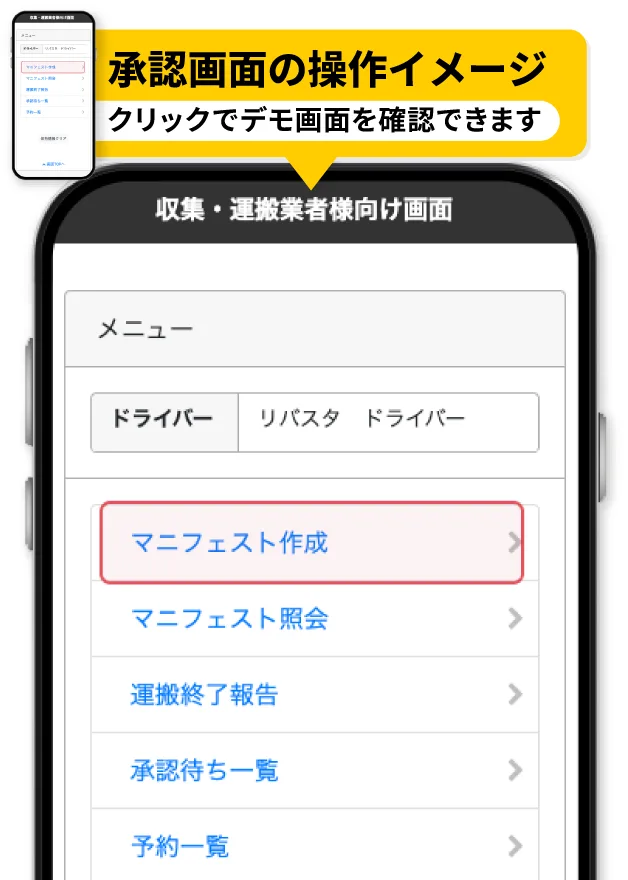 引渡し場所から離れた事務所のパソコンやスマートフォンで画像や位置情報を確認し、承認する機能です。現場担当者が常駐できないような小規模現場でも電子マニフェストを運用できる仕組みです。
