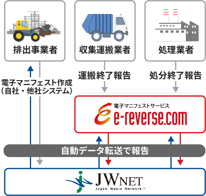 JWNETデータ取込機能とは、e-reverse.comを介さないで登録されたマニフェストデータを、JWNETから自動で取込み、全ての電子マニフェストデータをe-reverse.comの画面上で一元的に操作、管理ができる収集運搬業者様、処分業者様向けの有料オプション機能です。